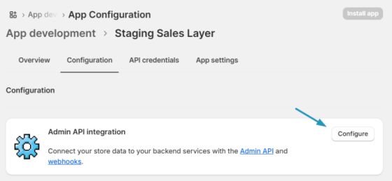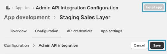 After installing the application, go to the API credentials tab to access the keys that need to be inserted in the connector under Parameters, in order to establish the link between the Shopify store and the Sales Layer connector: