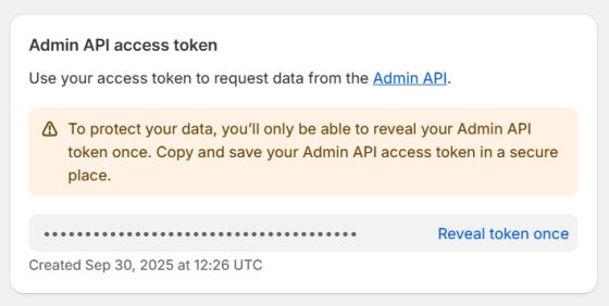 - Shopify Admin API Access Token → in the connector’s API Token field. (This value is accessible only once.)