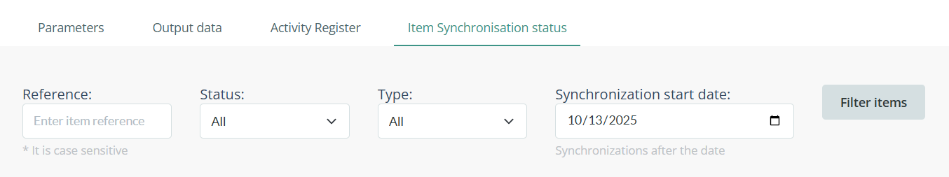 - Synchronization start date: Allows selecting the items that participated in one or more synchronizations. When selecting a date, all items that have been synchronized since that date onward will be displayed. For example, if you perform daily synchronizations and filter by a date from a week ago, you will see the information from the last seven days.