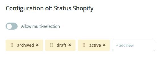The following example of Status Shopify works with a list of attributes field with multi-, whose options are active, draft, and archived. The same values must be used if working with a short text field instead of using a list.