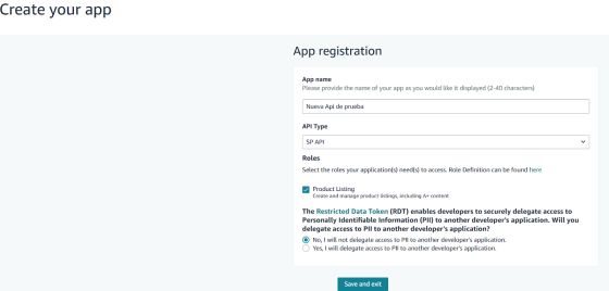 - Completar el nombre de la aplicación (por ejemplo: Sales Layer SP-API).