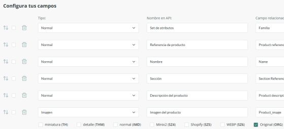 Datos de salida: Productos Campos disponibles Los campos que aparecen dependen del PIM. Típicamente incluyen:Conjunto de atributosReferencia de productoNombreSecciónDescripción del productoImagen del producto