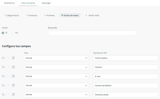 Datos de salida: Puntos de venta (opcional) Solo aparece si el cliente utiliza Puntos de Venta en su PIM. Activación Permite activar o desactivar la exportación de filas de PDV.