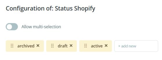 El siguiente ejemplo de Status Shopify trabaja con el campo tipo lista con selección única, cuyas opciones son active, draft y archived. Se deberán usar los mismos valores si se trabaja con el campo de texto corto en lugar de usar una lista.