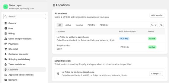 - Revisar ubicaciones para confirmar que haya una ubicación añadida en la tienda de Shopify.
