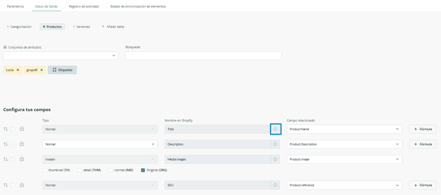 - Los campos repetidos en Variantes, que están en la pestaña de Productos, están pensados para el uso de datos sin variantes. Shopify crea variantes virtuales, pero al no enviar variante real por el conector, es posible mapear los campos en Productos.