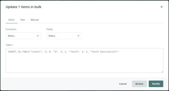 INSERT_IN_TABLE(“mode”, row 1, column 1, “value 1”, row 2, column 2, “value 2”, …, row n, column n, “value n”)