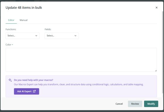 You can also use the Ask AI Expert button (purple) to consult our ChatGPT Macros Expert tool for guidance on using formulas. To learn more about its use cases and how to get the most out of this AI assistant, read this article.