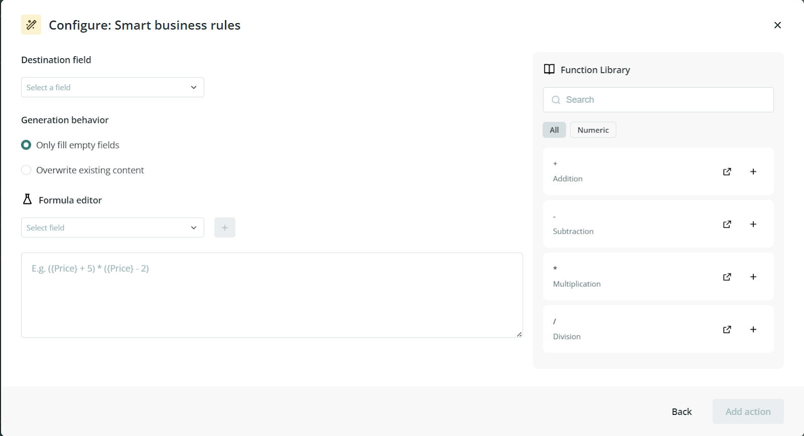 Before using this action on a large number of products, make sure the source fields used in the formula already contain consistent numeric values. It is also a good idea to test the rule first with a small group of products so you can confirm the result is being written to the correct destination field
